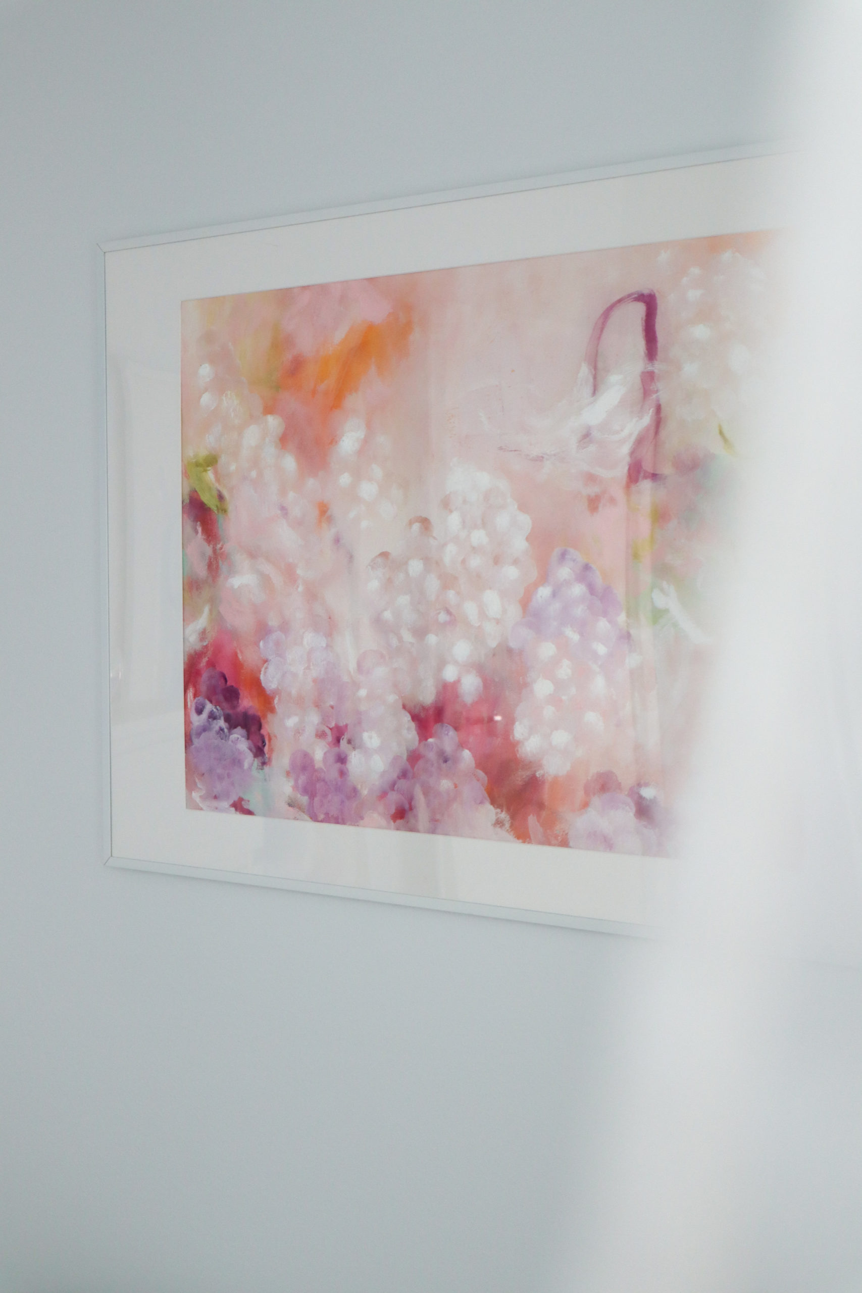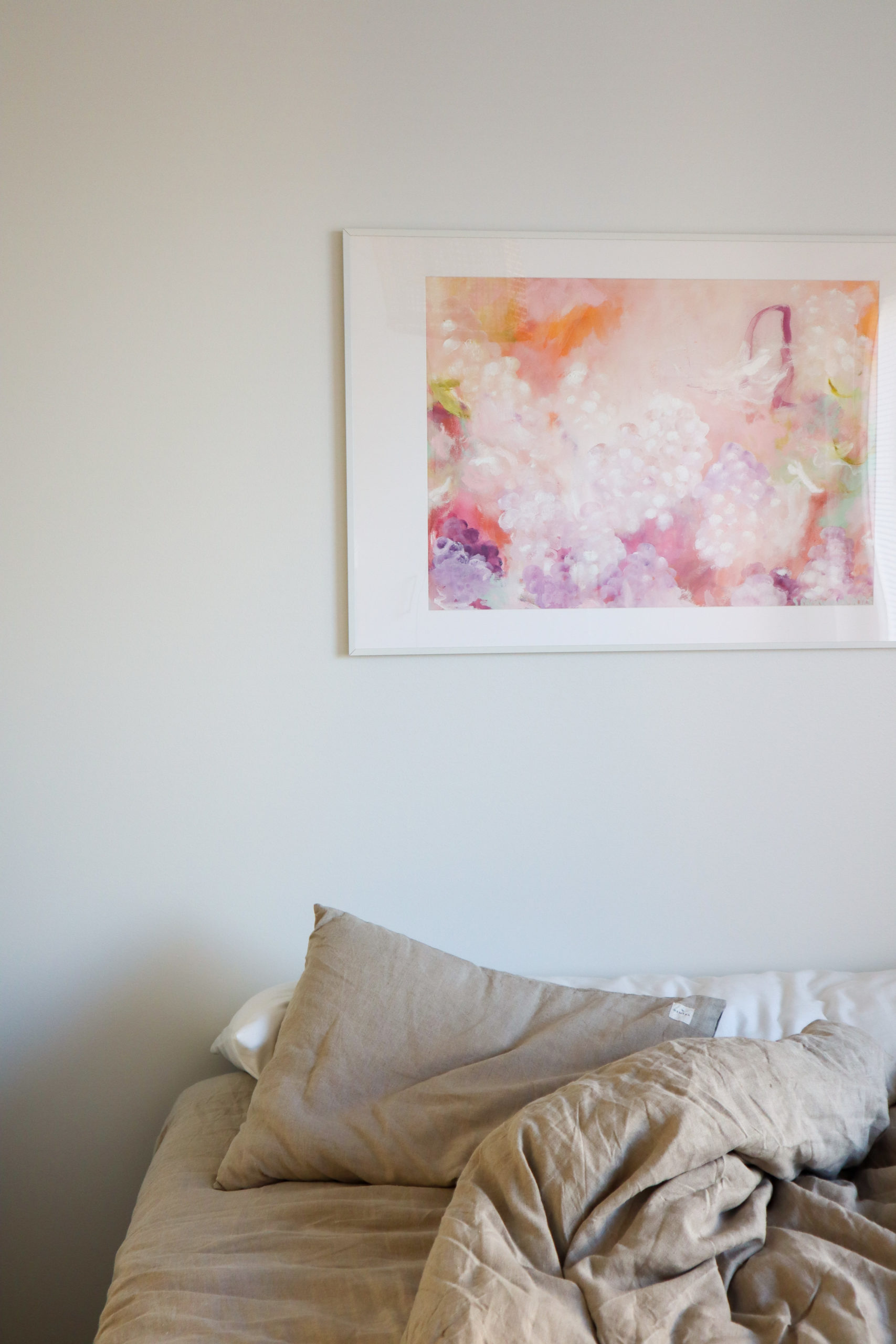 Toinen ihana taulu on Sanni Olasvuoren käsialaa ja tilasin sen häneltä tänä keväänä. Taululla on toistaiseksi väliaikaiset kehykset, sillä en vielä raskinut kehystyttää sitä. Olen seurannut Sannin Instagramia ja ihastellut hänen mielettömiä maalauksiaan. Viimein minulla on oma maalaus! Se on aivan mieletön, herkkä ja kaunis. Ja siis maalauksen sävyt ovat upeaita, aivan minun näköinen. Vaikka nämä huoneeni kaksi taulua ovat erilaisia, on niissä jotain samaa ja mielestäni ne sopii todella hyvin samaan tilaan.