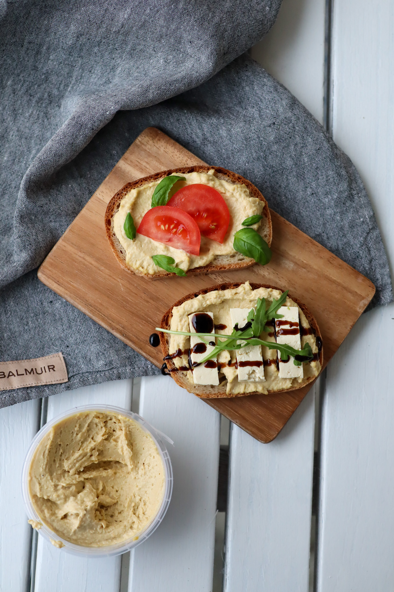 Hummus on todella hyvää leivän päällä ja muutkin erilaiset levitteet ja tahnat. Oma suosikkiyhdistelmäni on hummus, tomaatti ja basilika. Hummuksen kanssa sopii myös tofu. Kuvan leivässä on hummusta, tofus, rucolaa ja balsimicokastiketta. Hummusta saa myös monen makuisena, omia suosikkejani on Baba punajuurihummus ja Sevan hummus Hot n’ spicy.
