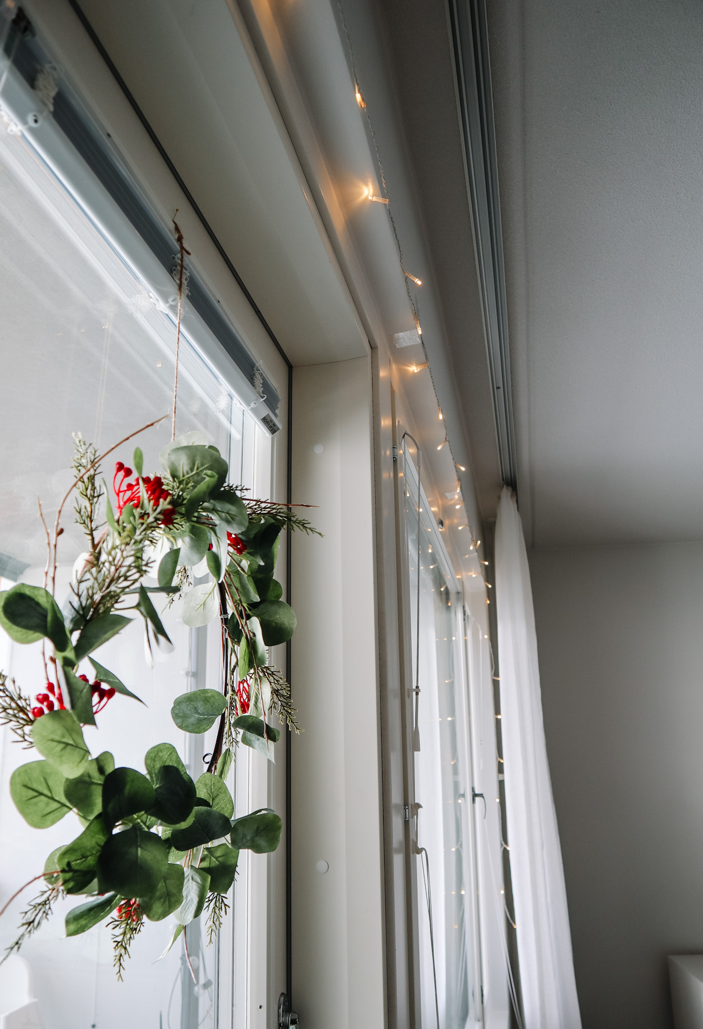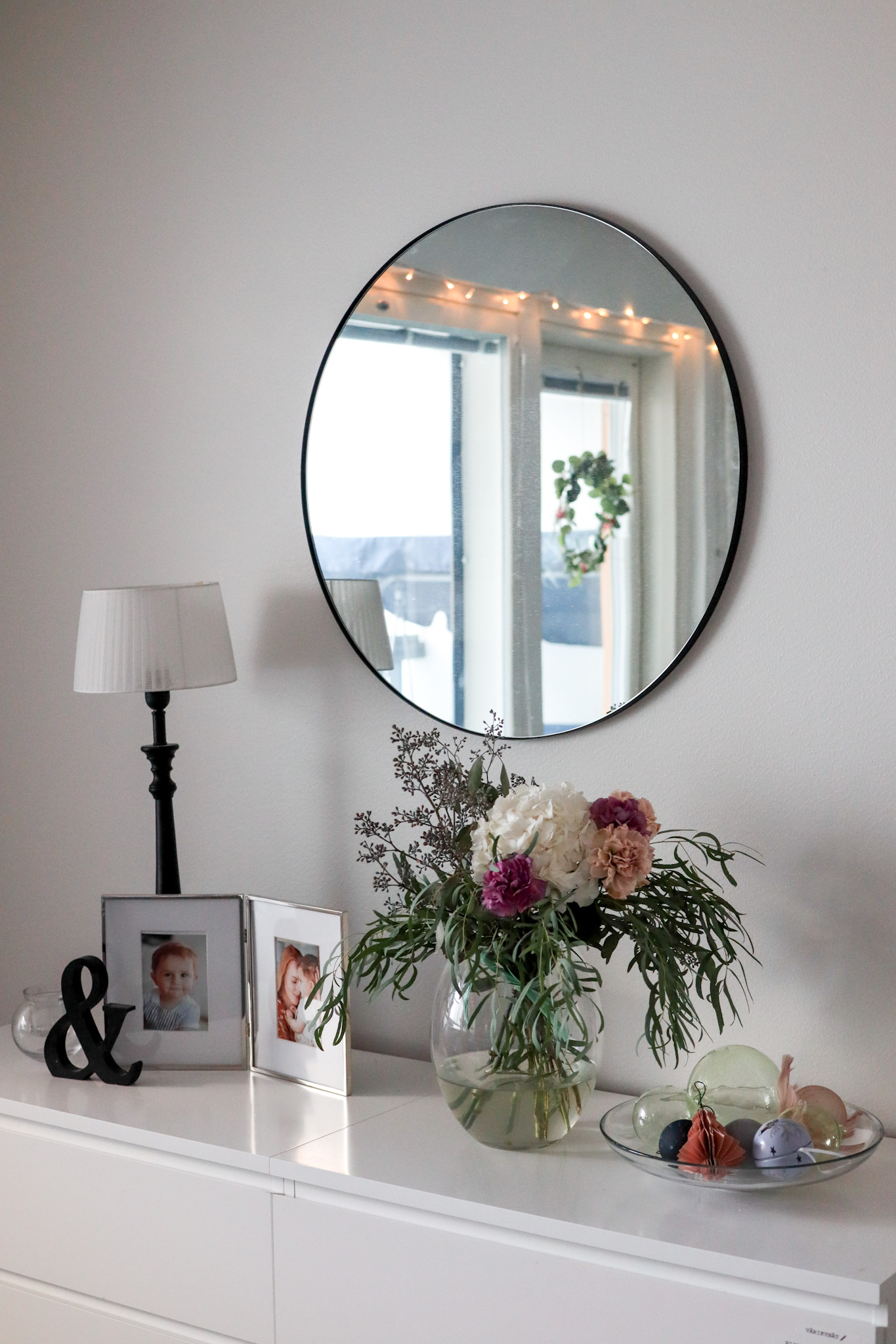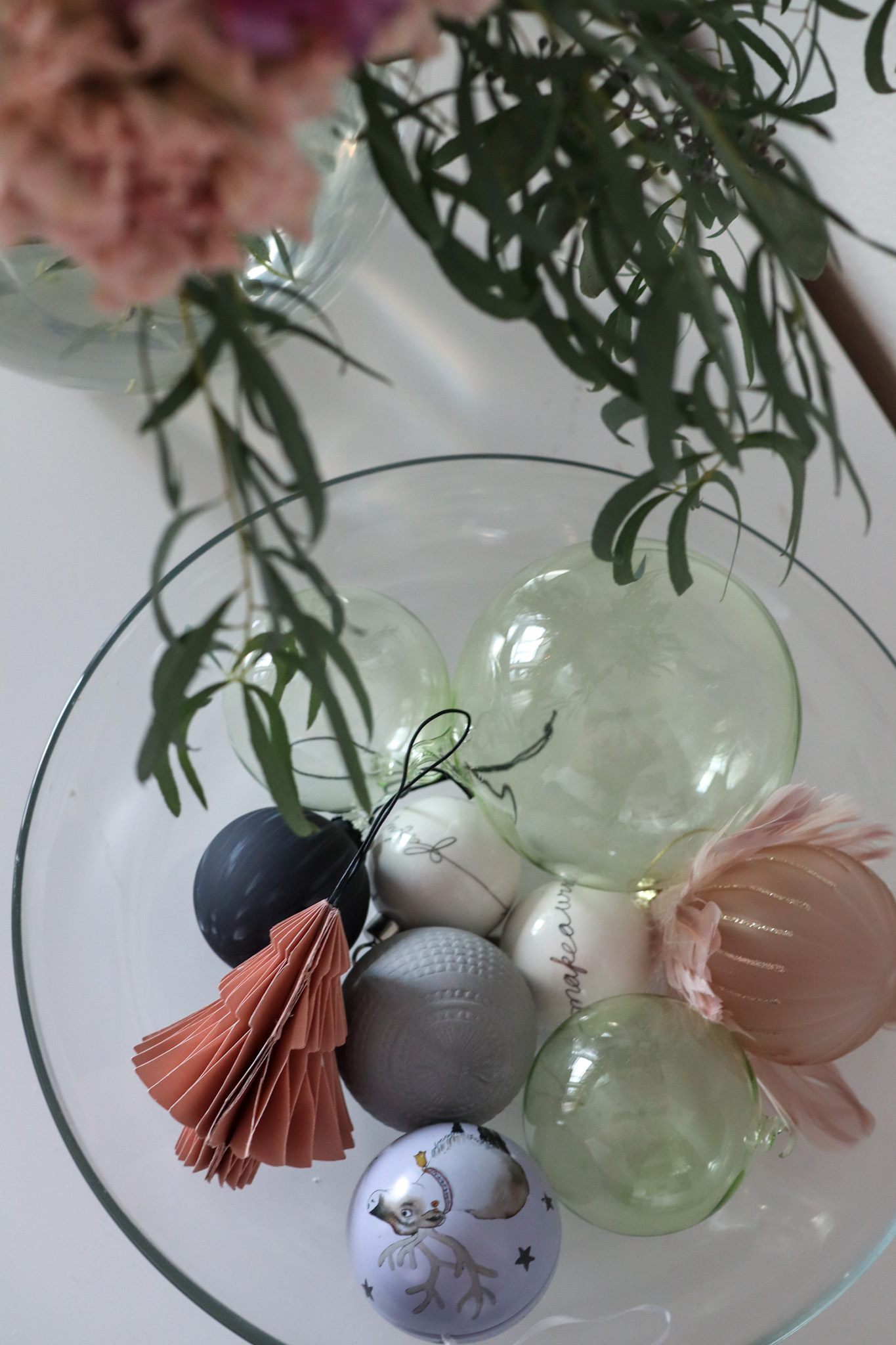 Jonkin verran olen jo laittanut kotiin joulua. Vaihdoin sohvatyynyt vihertäviin, laitoin talvivaloja, kranssin ikkunaan ja joulupalloja pöydälle laakeaan astiaan.