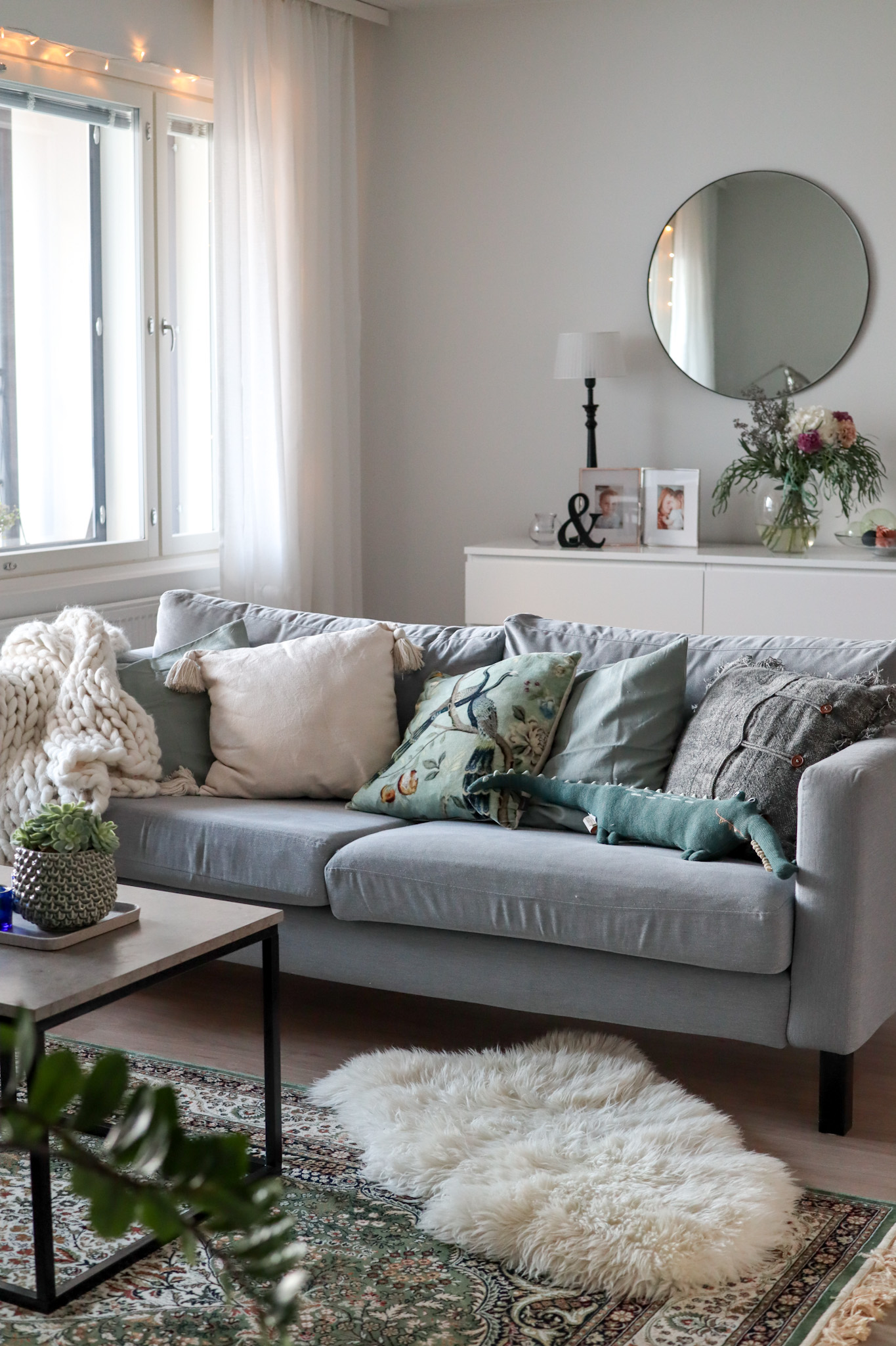 Lisäksi olohuoneen matto on vaihtunut. Aivan ihana vaalea matto oli ostettu Vekeltä, mutta se ei oikeastaan toiminut olohuoneessa. Se on puuvillamatto hyvin sileällä pohjalla ja se ei pysynyt lattiassa. Siirsin sen omaan makuuhuoneeseeni, sillä siellä se on ihan loistava ja sänky pitää mattoa hyvin paikallaan. Tämän hetkinen olohuoneenmatto on tilattu Mattokymppi-verkkokaupasta ja se on aivan ihana, eikä liiku muuten mihinkään, vaikka taapero ajaisi mopolla ympyrää. Lisäksi siinä ei kyllä näy likakaan!