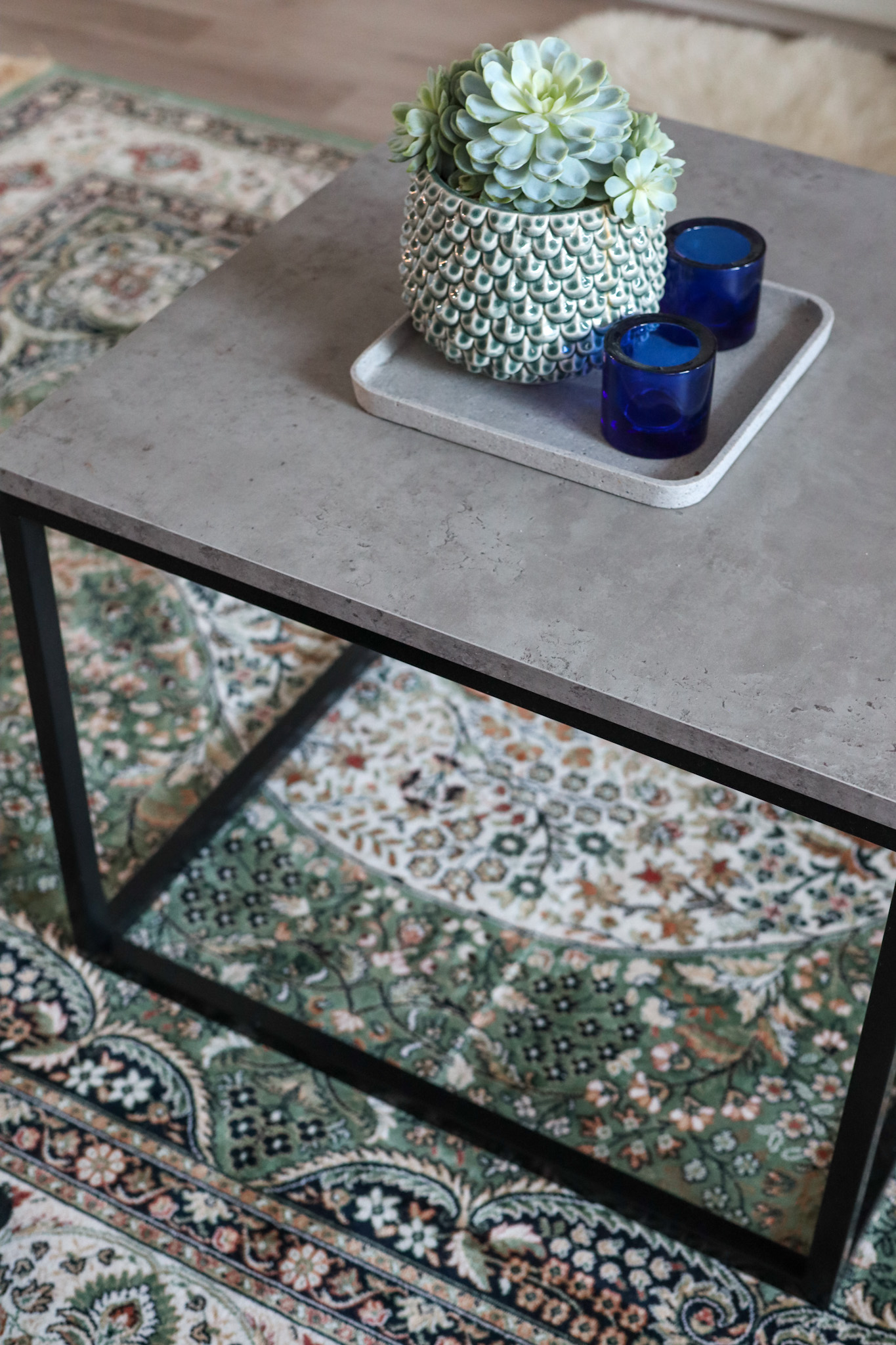 Olohuoneessa oli sohvapöytänä myös lasten leikkipöytä. Kun asuin vielä Helsingissä, oli minulla olohuoneessa aivan ihana marmoripöytä. Se kuitenkin oli 120cm pitkä ja vei tosi paljon tilaa. Sain pöydän myytyä eteenpäin, mutten ostanut uutta pöytää. Tänne muuttaessa Eemin huoneessa ollut pöytä päätyi olohuoneeseen. Pyöreä pöytä tuntui vievän tosi paljon tilaa. Nyt olohuoneessa on neliskanttinen pöytä, joka löytyi edullisesti. Pintalevy ei ole kovin laadukasta, sillä kasatessa jo ruuvasin ruuvin pöydän pinnasta läpi ja näin ollen siinä on nyt reikä. Mahdollisesti jalkoihin voisi tehdä itse pöytälevyn.