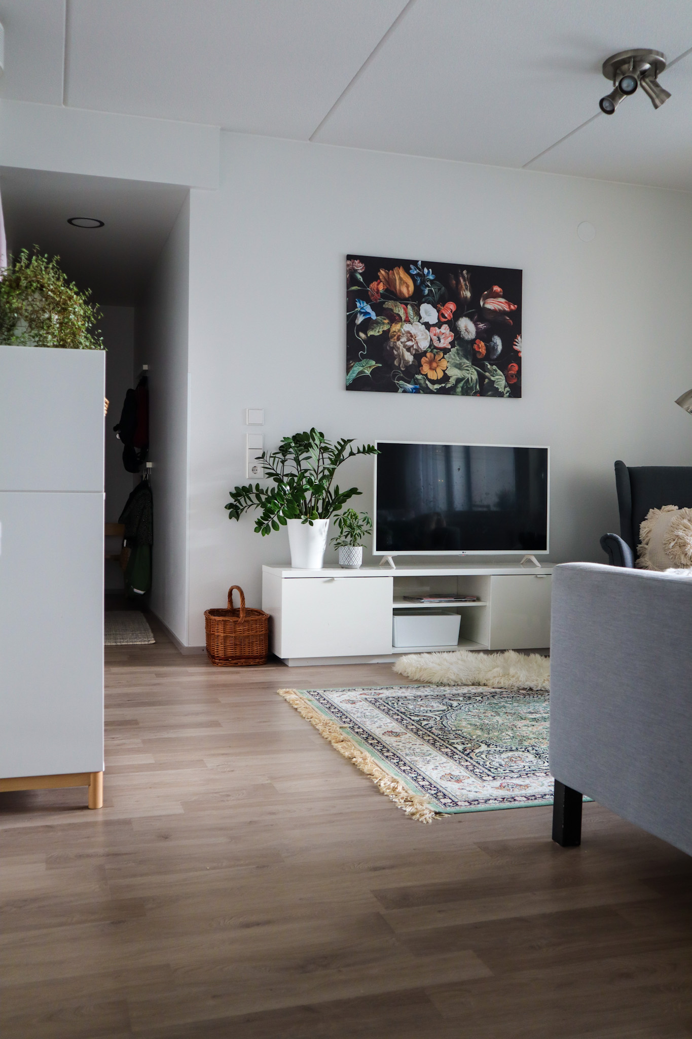 Alla on kuvia olohuoneesta. Mielestäni se on tosi ihana! Yksi seuraajistani tosin laittoi jo aiemmin viestiä, että takaseinäällä, Ikean Malm-lipastojen vieressä olisi täydellinen paikka isommalle viherkasville. Ja ihan totta, nyt olen vain tuijottanut tuota kohtaa ja ajatellut, että siinä on todellakin aukko, joka tulee täyttää. Kasvi toisi varmasti lämpöä ja kodikkuutta nurkkaukseen, sillä seinämä on edelleen tosi vaalea.Sieltä vähän puuttunut jotain.