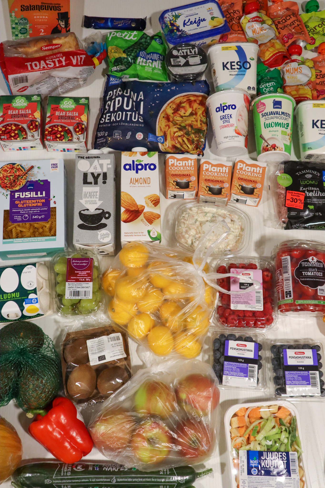 Jotenkin hurjaa kuvata kauppakassien sisältö. Kuvassa näyttää siltä, ettei oikeasti ostanut juuri mitään, mutta useita kymppejä meni kuitenkin. Pöydälle aseteltuna ostokset näyttää niin vähäisiltä. Sama juttu, kun tuotteet laittaa paikoilleen. Ne vaan kato johonkin ja jääkaappi ei muuttunut edes täydeksi! En juurikaan vertaile tuotteiden hintoja, vaan ostan sitä samaa tuttua ja hyväksi todettua, esim juuri vegaanisten tuotteiden kohdalla. Kotimaisuus ja luomu painaa myös valintoja tehdessä. Näin ollen ruoka kyllä tulee melko kalliiksi.