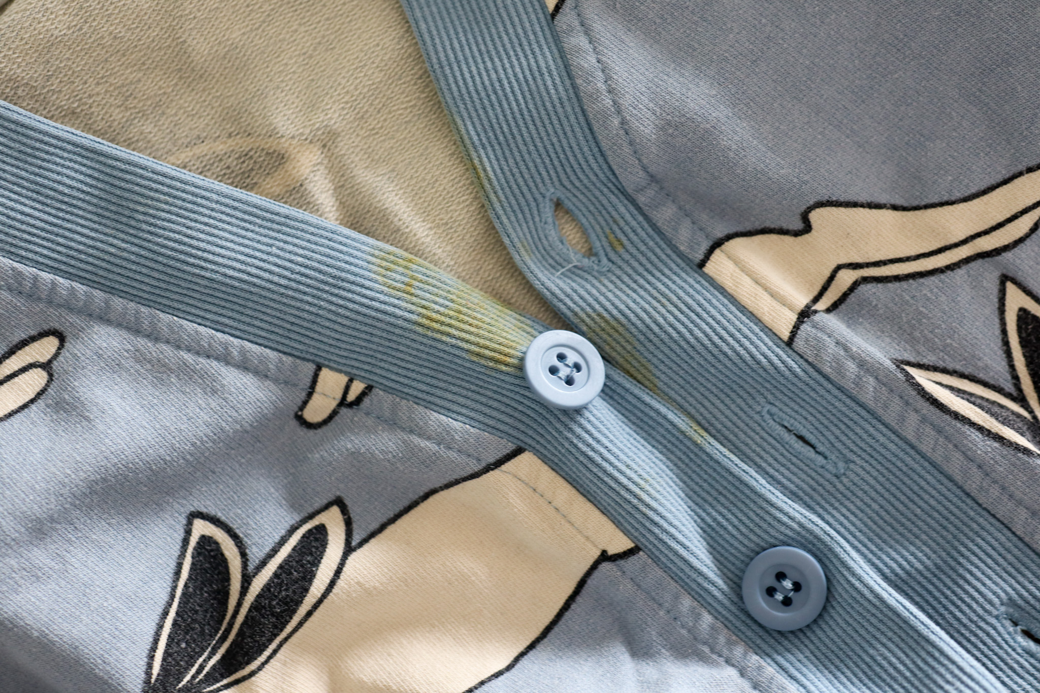 Minulla on ollut sellainen mentaliteetti, että vaatteet ovat käyttöä varten. Likaantuminen kuuluu elämään ja tahrat eivät ole maailmanloppu. Lapseni ei ole oikeastaan koskaan liiemmin välittänyt ruokalapusta. Se on aiheuttanut hänelle vain pahaa mieltä ja siitä syystä en ole hänellä ruokalappua käyttänyt sitten vauvavuoden soseiden. Vaatteissa on usein ruokatahroja, välillä tussia, värikynää, sormiväriä ja ulkoilusta tulleita tahroja, kuten nurmikkoa tai voikukkaa. Aina ruokalua varten ei ole mahdollista ottaa vaatteita pois ja vahikoja sattuu. Myös päiväkodista kulkeutuu tahraista pyykkiä, joihin tahrat ovat saattaneet jo pinttyä.