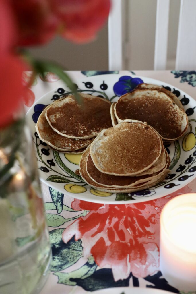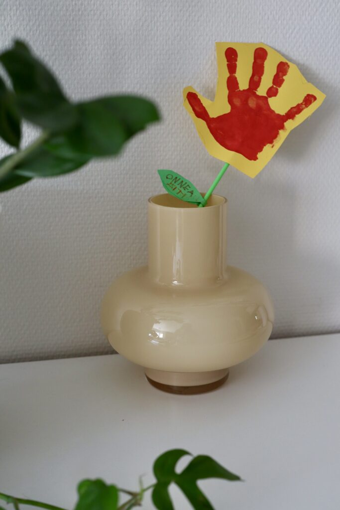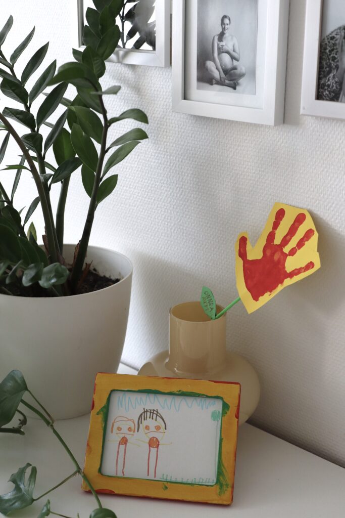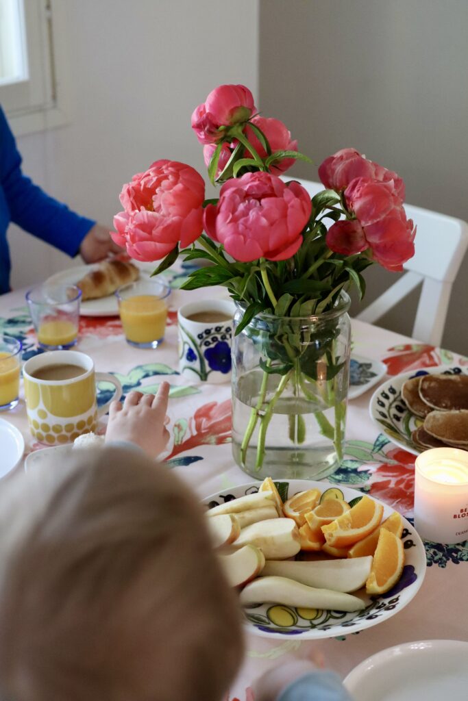 Omassa lapsuudessani me lapset teimme aina isän kanssa aamupalaa äidille. Aamupalan ollessa valmis, menimme herättämään äitiä ja annoimme itse askarrellut kortit hänelle. Se oli kutkuttavaa ja jännittää. Oli niin ihana yllättää äiti ja tehdä yhdessä salaisia puuhia! Niinpä toivoin saavani herätä valmiiseen aamupalapöytään ja tämä toteutuikin. Esikoinen oli tehnyt minulle varhaiskasvatuksessa kukkakortin ja upean taulun lahjaksi. Hän oli tietysti niistä todella innoissaan ja yhdessä ihailimme niitä! Sain myös Marimekon Umpu -maljakon lahjaksi. Sen esikoinen oli ideoinut miehen kanssa yhdessä.
