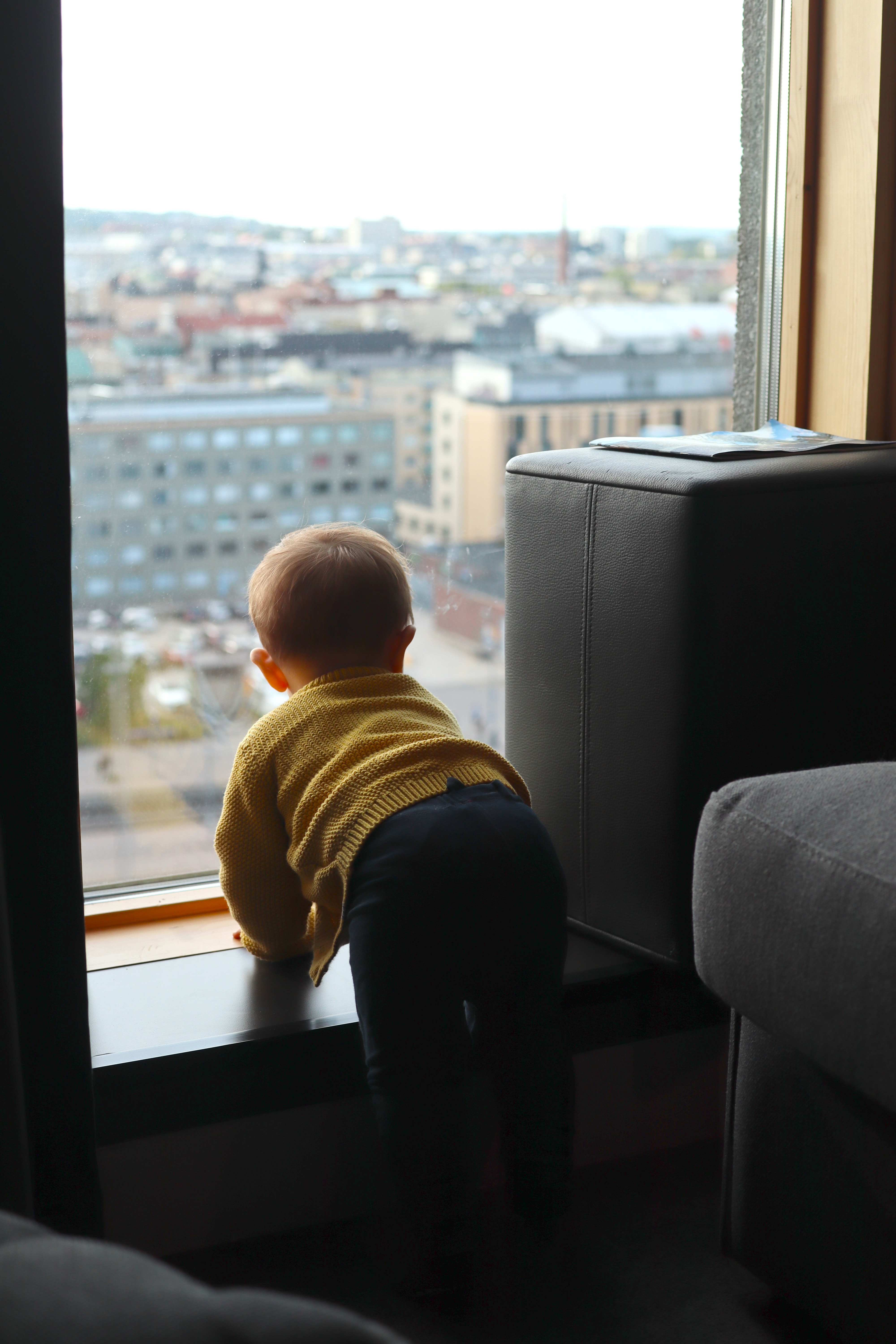 Hotellin ylimmässä kerroksessa on aivan mielettömät näkymät Tampereen ylle. Siellä toimii Moro Sky Bar, jonne jokainen voi piipahtaa, vaikkei olisi hotellin asiakas. Tampereella on todella paljon kivaa tekemistä lasten kanssa. Ja ilmaista sellaista, kuten aivan upea Tiitiäisen satupuisto ja Pikku Kakkosen puisto.Ja toki Tampereella on maistettava mustamakkaraa ja Pyynikin munkkeja. Tallipihan suklaapuodissa on käytävä herkuttelemassa. Me saimme aivan äärimmäisen hyvää palvelua Pella’s Cafessa ja Guru’s Kitchen & Bar -ravinolassa. Molemmissa paikoissa tarjoilijat tulivat ottamaan Eemin syliin luvallani ja sanoivat, että nyt annetaan äidin syödä rauhassa. Olin aivan suu pyöreenä sellaisesta ystävällisyyden osoituksesta. Pakko vielä hehkuttaa Pella’ Cafe-kahvilaa aivan mielettömästä gluteenittomasta valikoimasta, jonka lisäksi muutkin erityisruokavaliot huomioidaan hienosti. Ihana Tampere! Eemille ostimme tietty todellisesta lelukaupasta uuden pallon kotiin viemisenä nimipäivän kunniaksi. Kaiken uuden upean lomassa hukkasin takkini, yhden tutin, yhden tossun ja juuri Radiokirppikseltä ostetun dinosauruksen.