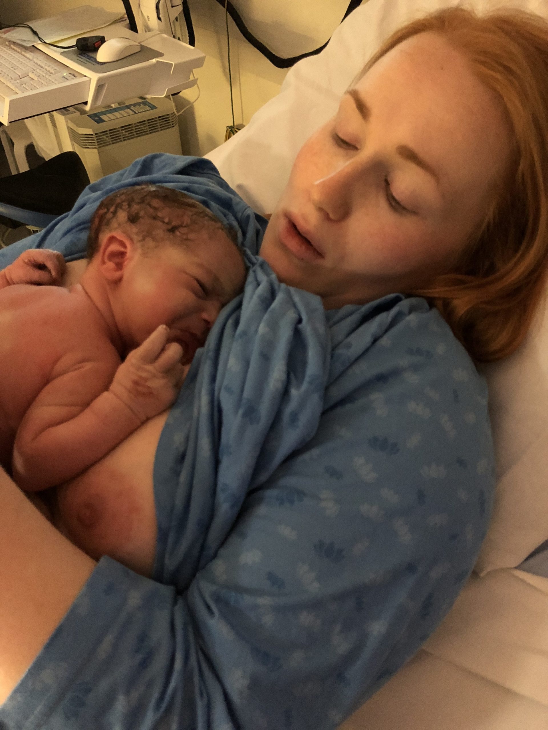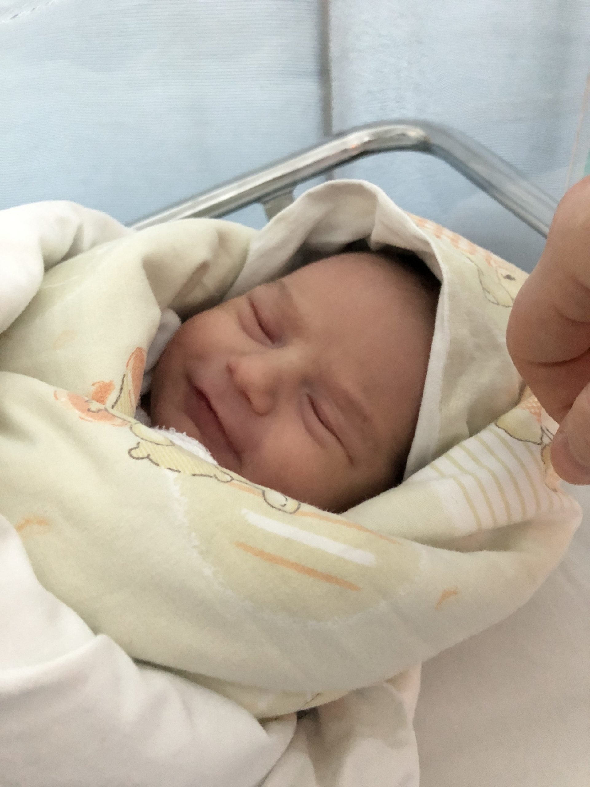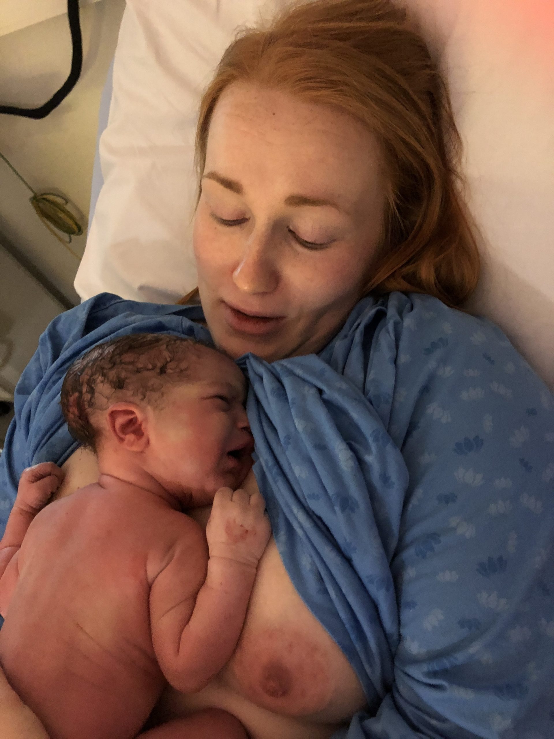 Vielä puolilta öin ei olisi uskonut, että parin tunnin päästä minulla on vauva sylissä, mutta niin se vain tapahtui! Pian tuli myös istukka, joka oli selkeästi yliaikainen ja olikin todella hyvä, että synnytys oli käynnistetty. Olin saanut repeymän, joka ommeltiin kiinni. Pian kävin suihkussa ja sain syömistä. Aamun valjetessa pääsin vauvan kanssa osastolle kahden hengen huoneeseen ja äitini lähti kotiin. Olimme osastolla kaksi päivää ennen kotiuttamista. Minulla oli hirveä kiire päästä sairaalasta kotiin, sillä koin oloni todella yksinäiseksi. Osastolla ei saanut käydä vieraita, vaan vieraat piti vastaanottaa kahvilassa. Yksi tukihenkilö sai vierailla osastolla per synnyttäjä klo 08.00-20.00 välillä, mutta tietysti oma äitini oli töissä suuren osan päivää.