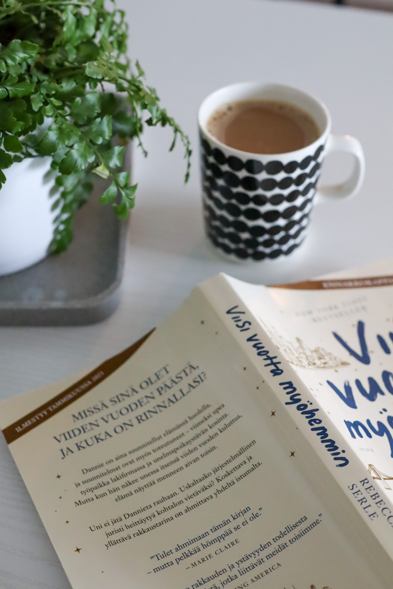 Tammikuussa päätin, että alan lukea ihan oikeita fyysisiä kirjoja. Asetin tavoitteeksi lukea yhden kirjan kuukaudessa. Tällä hetkellä olen melkein saanut luettua kaksi kirjaa, eli tavoite tammikuun osalta on melkein tuplattu. Ei olisi voinut paremmin alkaa! Luin Rebecca Serlen kirjan Viisi vuotta myöhemmin. Ja todella koko kirjan alkuosan luulin tietäväni miten kirja päättyy. Kuvittelin lukevani tyypillistä rakkaushömppää. Puolessa välissä suunta kuitenkin muuttuu ja kirja päättyy eri tavoin kuin oletin. Se jopa sai kyyneliin. Kohta saan päätökseen Jojo Moyesin Tähtien antaja -kirjan.