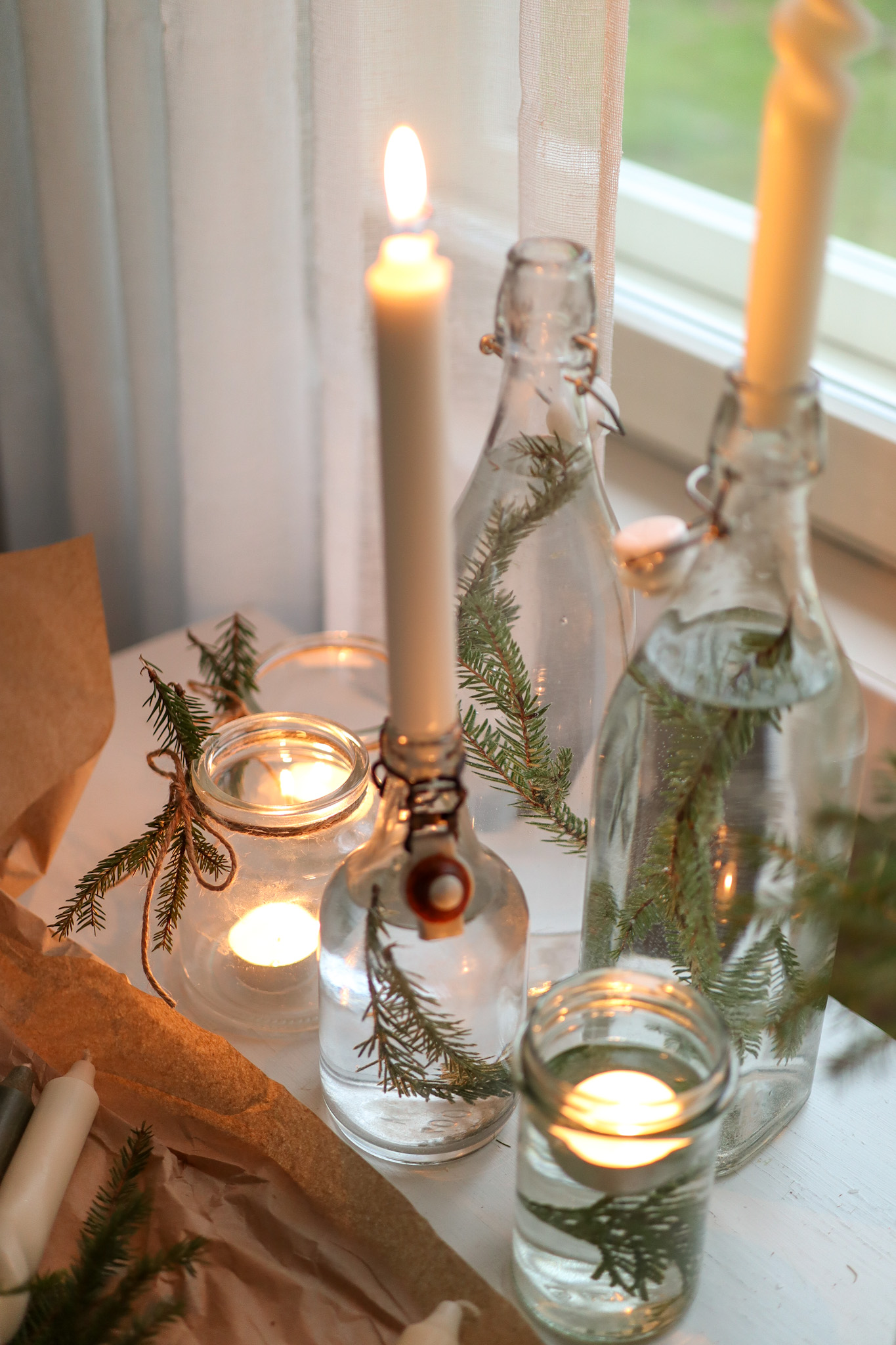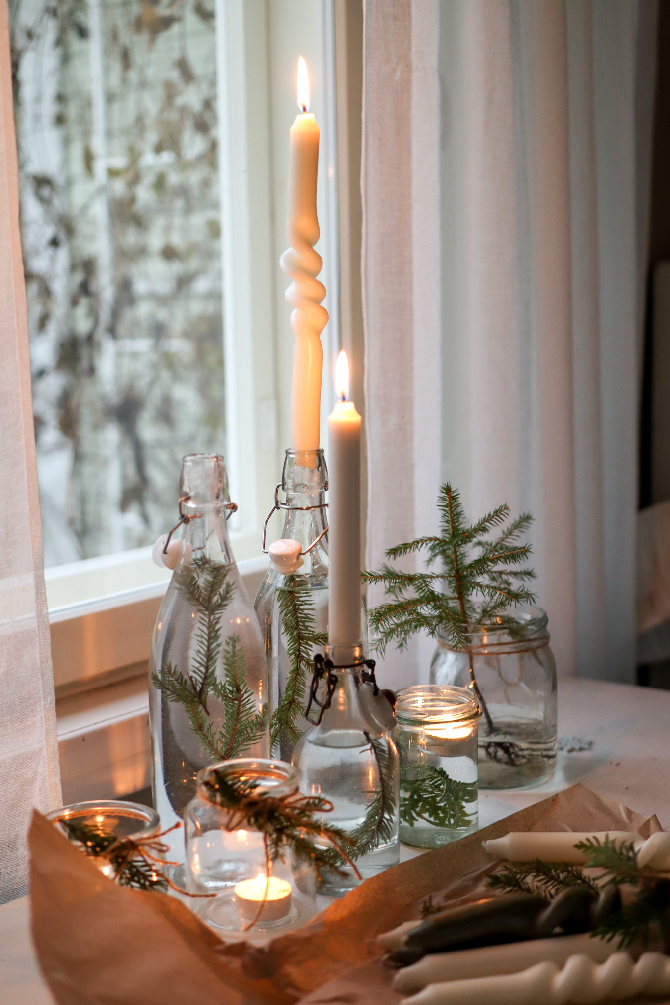 Tänään itsenäisyyspäivän kunniaksi tein ikkunalle tämän kauniin asetelman. Asetelman tekee kynttilät, lasipullot ja purkit sekä kuusen oksat. Se on yksinkertaisuudessaan todella kaunis ja todella helppo toteuttaa!