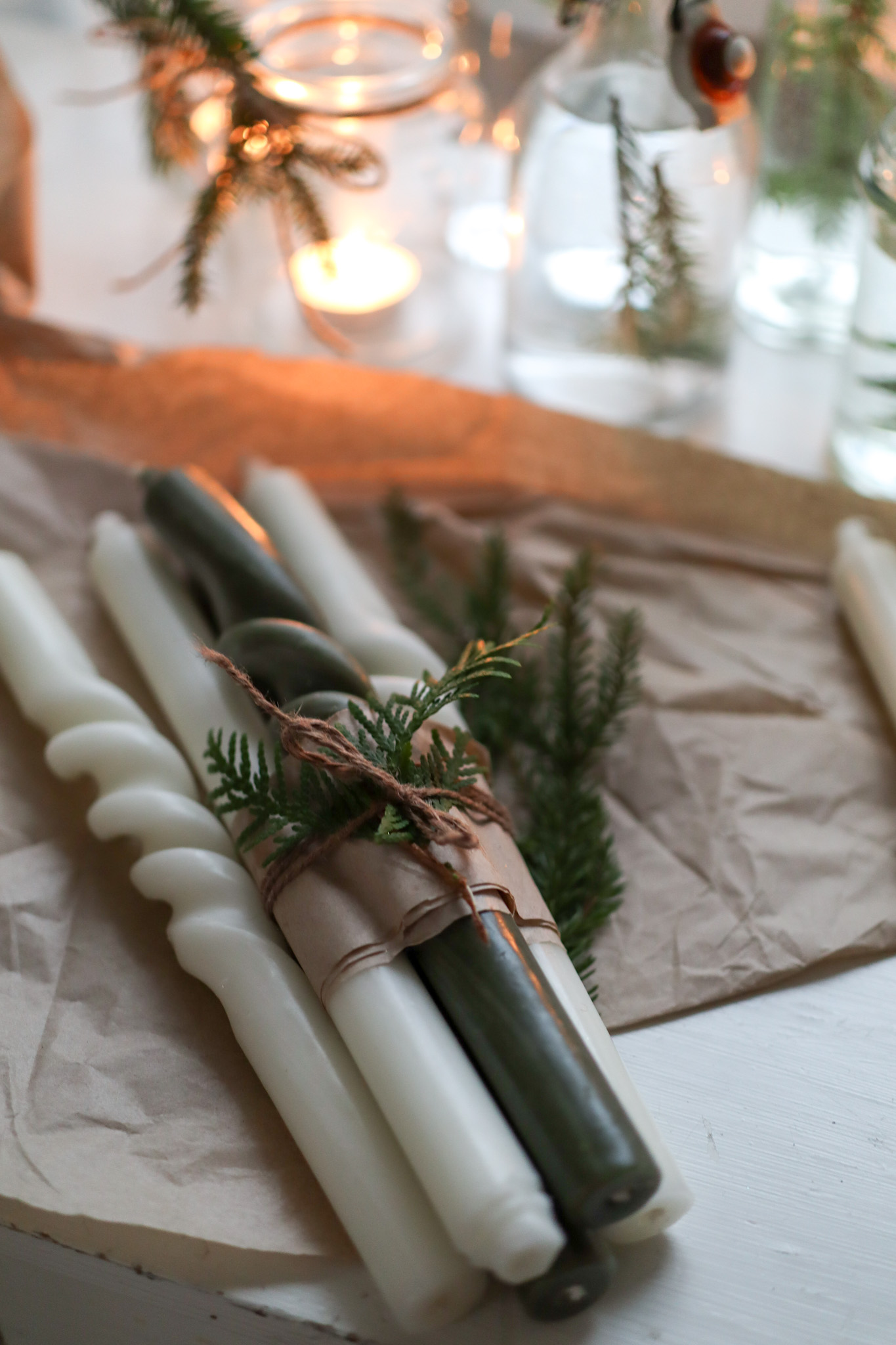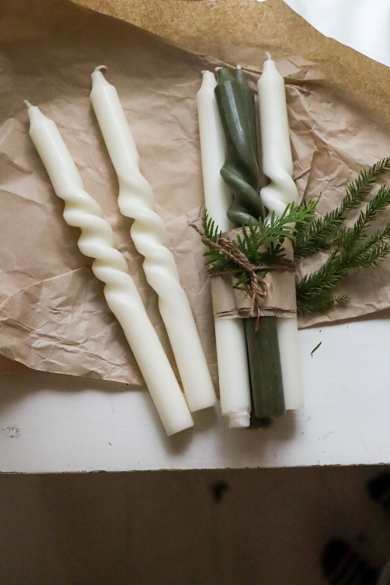 Kokeilin tehdä parafiinikynttilöistä kierrekynttilöitä ja ne onnistuivatkin aivan ihanasti. Kierrekynttilät näyttävät mielestäni kauniilta ja kivan erilaisilta. Ne toimivat kivana lahjanakin tuoden pientä luksusta tavalliseen kynttilään! Itse sidoin kynttilöitä nippuihin. Laitoin ruskeaa lahjapaperia ensin suikaleen kynttilöiden ympärille ja sitten sidoin ne juuttinauhalla. Sujautin vielä tuijan oksan nauhan alle ja näin ihan kynttilöistäkin tuli todella kaunis lahja, jonka antaa mielellään.