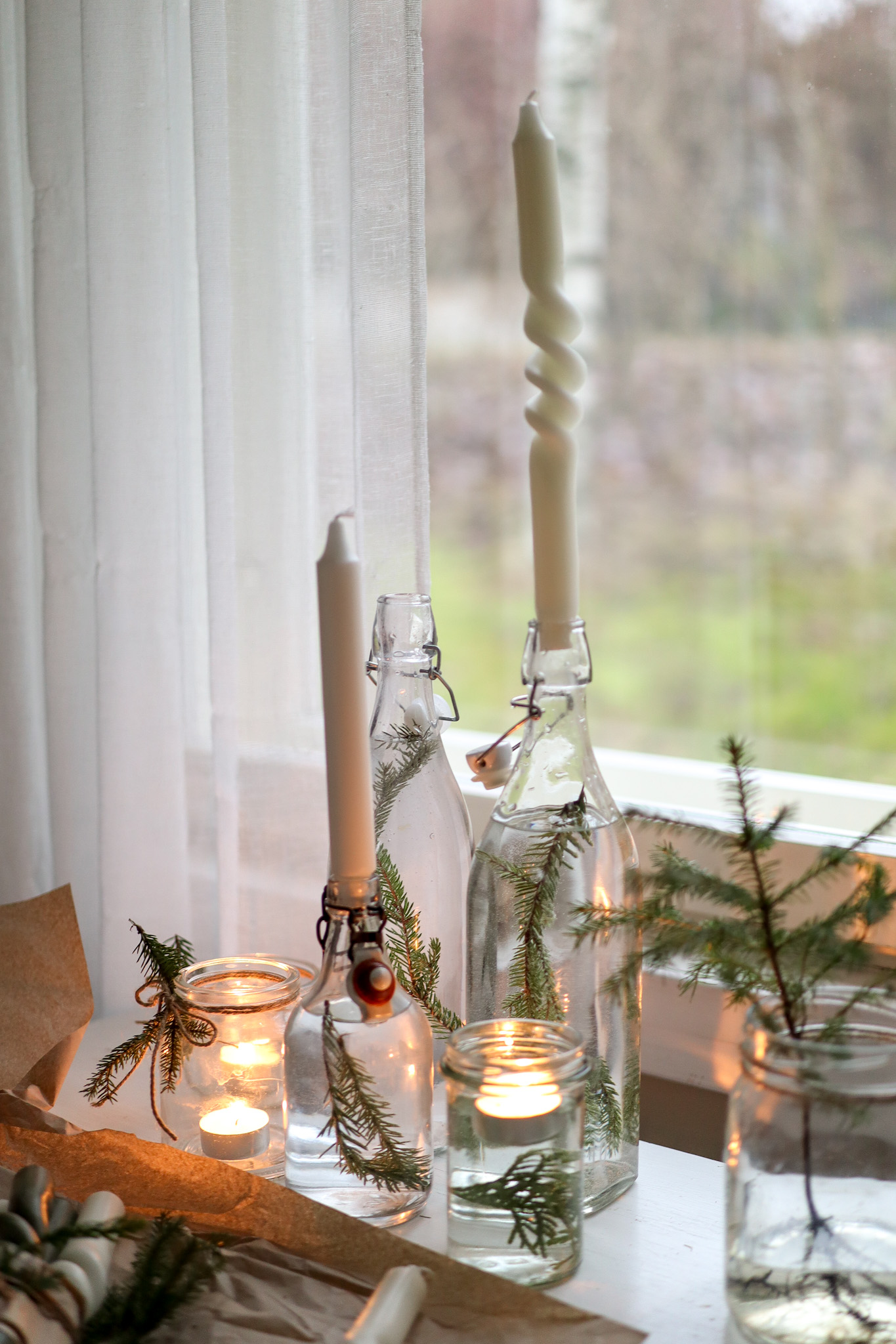 Tänään itsenäisyyspäivän kunniaksi tein ikkunalle tämän kauniin asetelman. Asetelman tekee kynttilät, lasipullot ja purkit sekä kuusen oksat. Se on yksinkertaisuudessaan todella kaunis ja todella helppo toteuttaa!