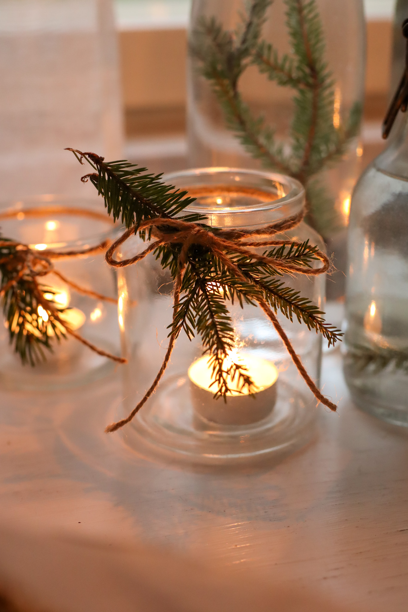 Vedellä täytettyihin lasipulloihin laitoin kynttilöitä, jolloin ne toimii kynttilänjalkoina. Lasipurkkeihin tein kahdenlaisia asetelmia. Yhteen lasipurkkiin laitoin oksan ja vettä sekä tuikkukynttilän kellumaan veden päälle. Tuikkukynttilä näyttää kauniilta lasipurkissa myös sellaisenaan ja kahteen purkkiin laitoinkin pelkän tuikun. Sidoin purkin ympärille kuusen oksan juuttinauhalla. Kynttilöitä poltettaessa muista turvallisuus, lue lisää esim. marttojen-sivuilta. Pienen suuaukon omaava purkki ei ole hyvä tuikulle, sillä lämpötilanvaihtelut aiheuttaa jännitteitä ja purkki voi särkyä. Lasipurkin tulisi omata suuri suuaukko tai vaihtoisesti voi käyttää led-tuikkua.
