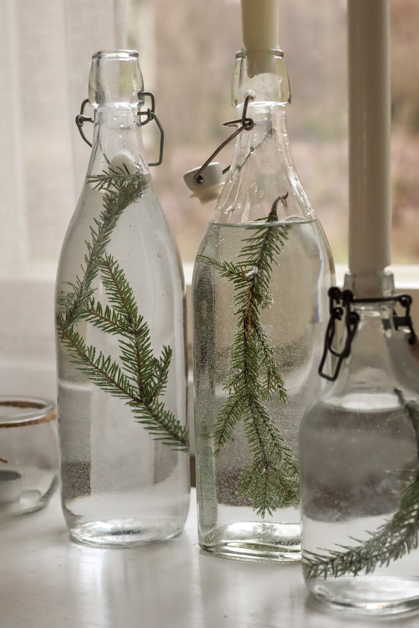 Täytin lasipullot ja -purkit puhtaalla vedellä, jonne tiputin kuusen oksan joukkoon. Niin eukalyptuksen oksa kuin tuijan oksakin toimii yhtä hyvin, jos kuusen oksia ei ole saatavilla.