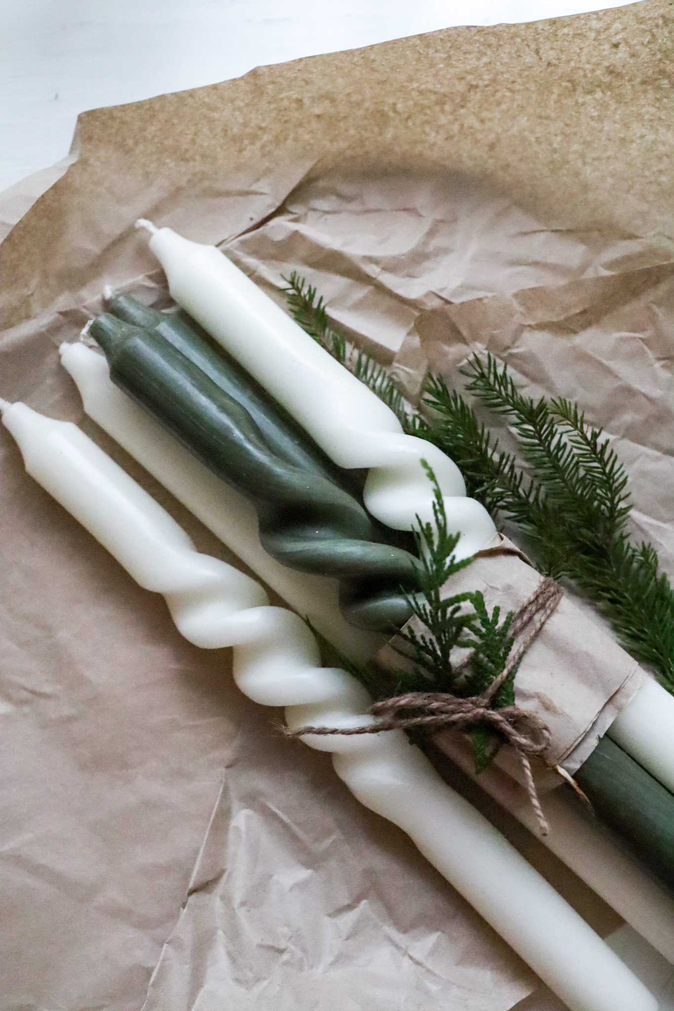 Kokeilin tehdä parafiinikynttilöistä kierrekynttilöitä ja ne onnistuivatkin aivan ihanasti. Kierrekynttilät näyttävät mielestäni kauniilta ja kivan erilaisilta. Ne toimivat kivana lahjanakin tuoden pientä luksusta tavalliseen kynttilään! Itse sidoin kynttilöitä nippuihin. Laitoin ruskeaa lahjapaperia ensin suikaleen kynttilöiden ympärille ja sitten sidoin ne juuttinauhalla. Sujautin vielä tuijan oksan nauhan alle ja näin ihan kynttilöistäkin tuli todella kaunis lahja, jonka antaa mielellään.