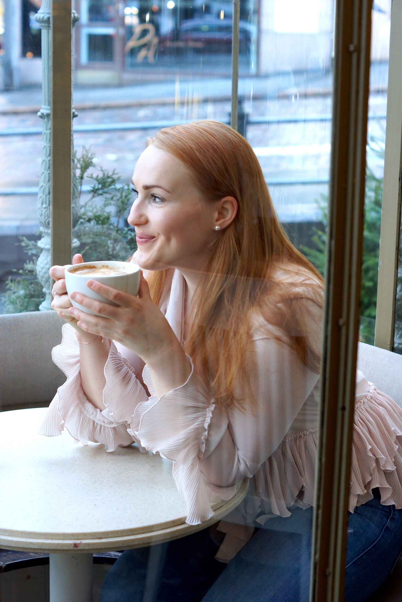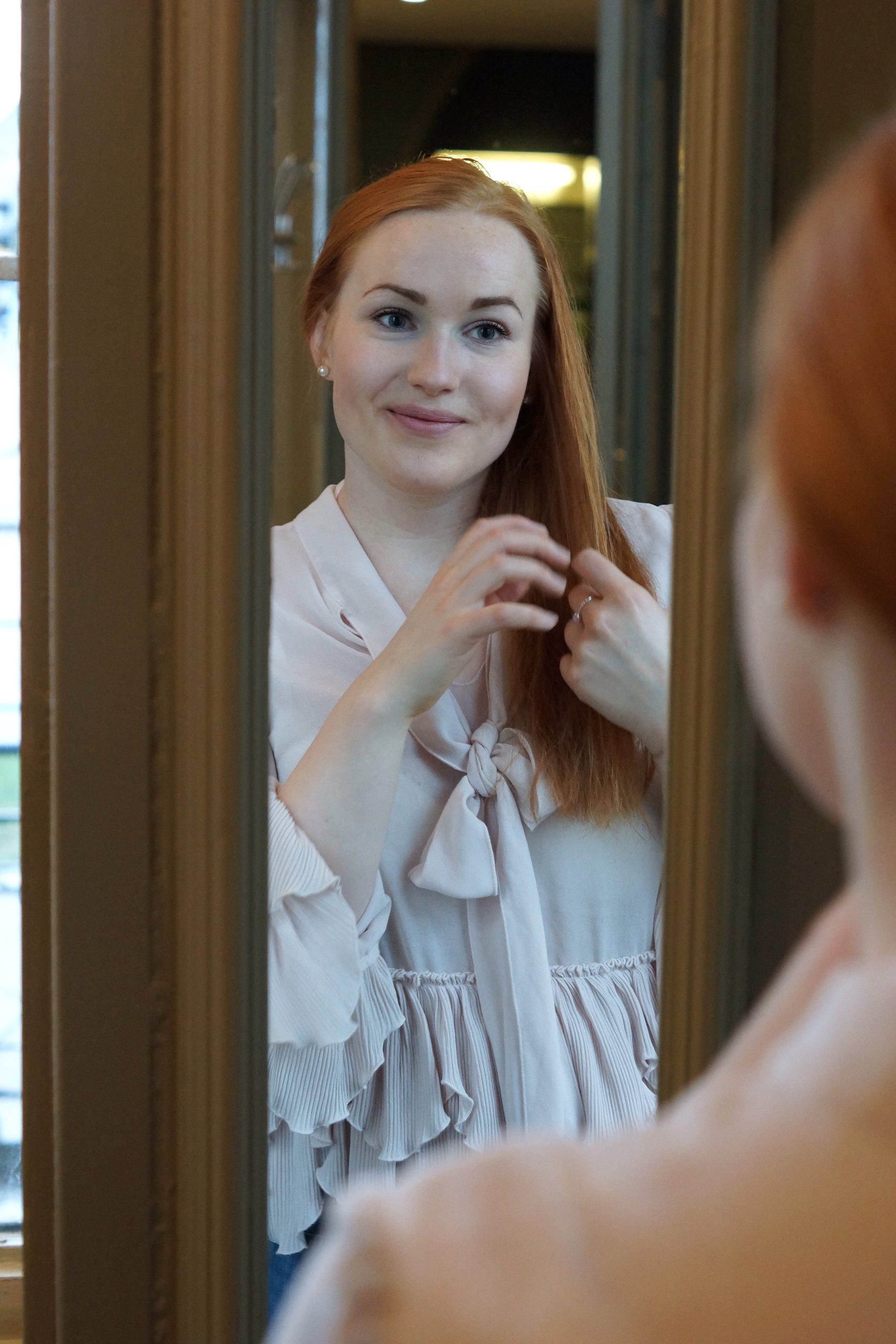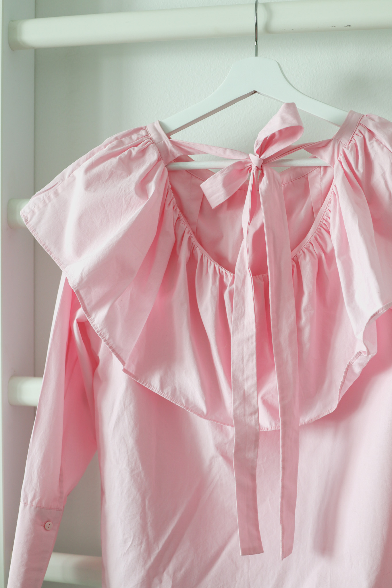 Vaaleanpunainen paita röyhelökauluksella