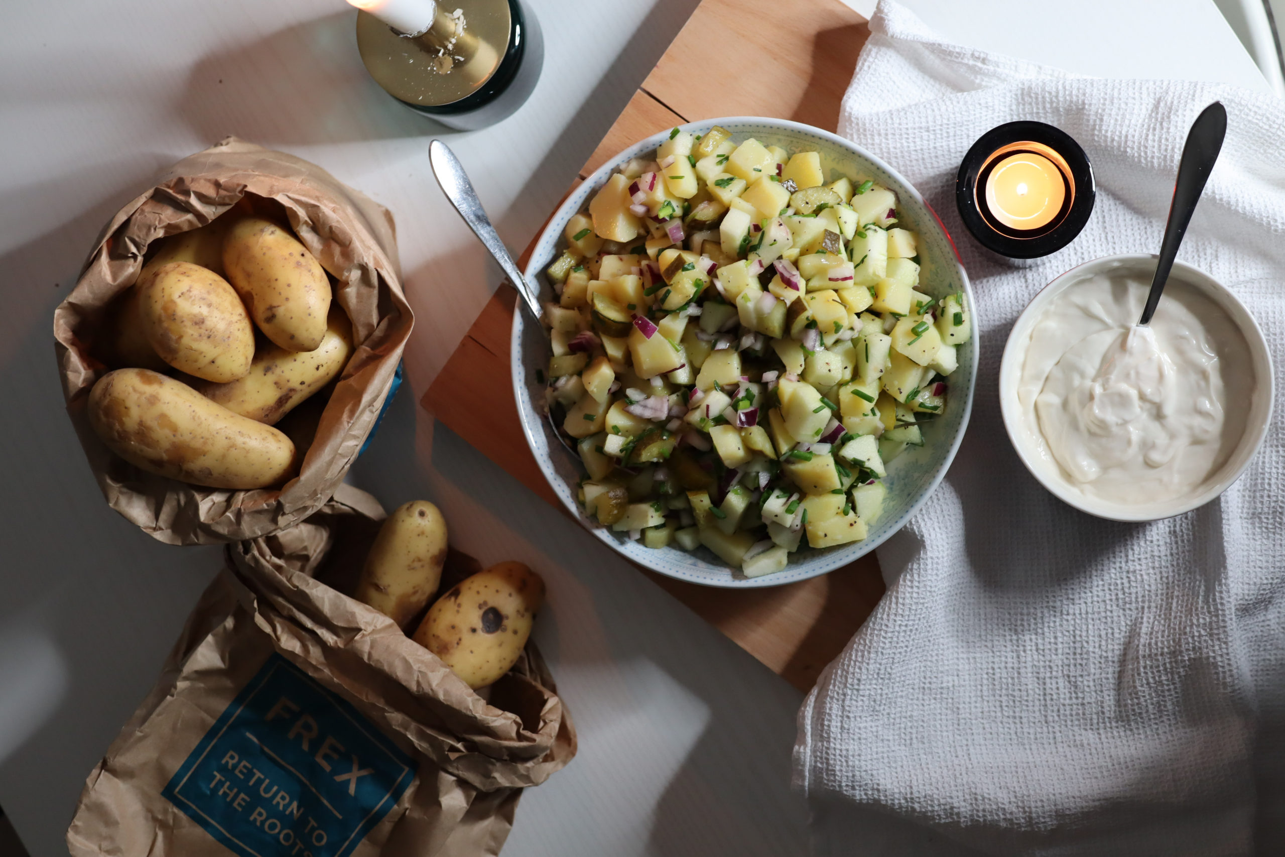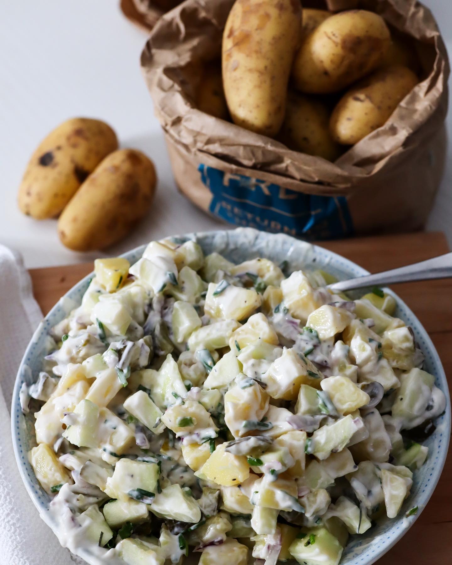 Perunasalaatti on kyllä aivan ehdoton herkku uuteen vuoteen! En muista olenko kovinkaan montaa kertaa tehnyt perunasalaattia itse, sillä perunoiden keitto tuntuu mikä niin työläältä. Todellisuudessa perunat kiehuu sillä välin, kun pilkkoo muut aineet salaattiin ja tekee kastikkeen.